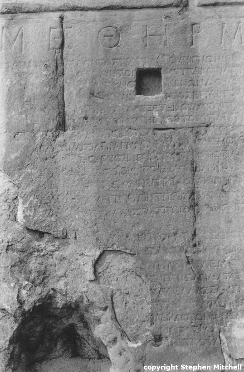 Yazıtın yunancası tapınağın güney-doğu cephesinde yer almaktadır. Osmanlı dönemi’nde bu duvara bitişik evlerin iç mekanında kalması itibarıyla korunmuş olduğu gibi bir o kadar da bu evlerin tavan hatıllarının yerleştiği yuvalar nedeniyle de kısmen tahrip olmuştur. Yazıt 35 bölüm ve 1 ekten oluşmaktadır. 19 sütun halinde kazınmıştır. Burada sunulan ingilizce metin Profesör Dr. Alison E. Cooley'den alınan izinle paylaşılmaktadır.