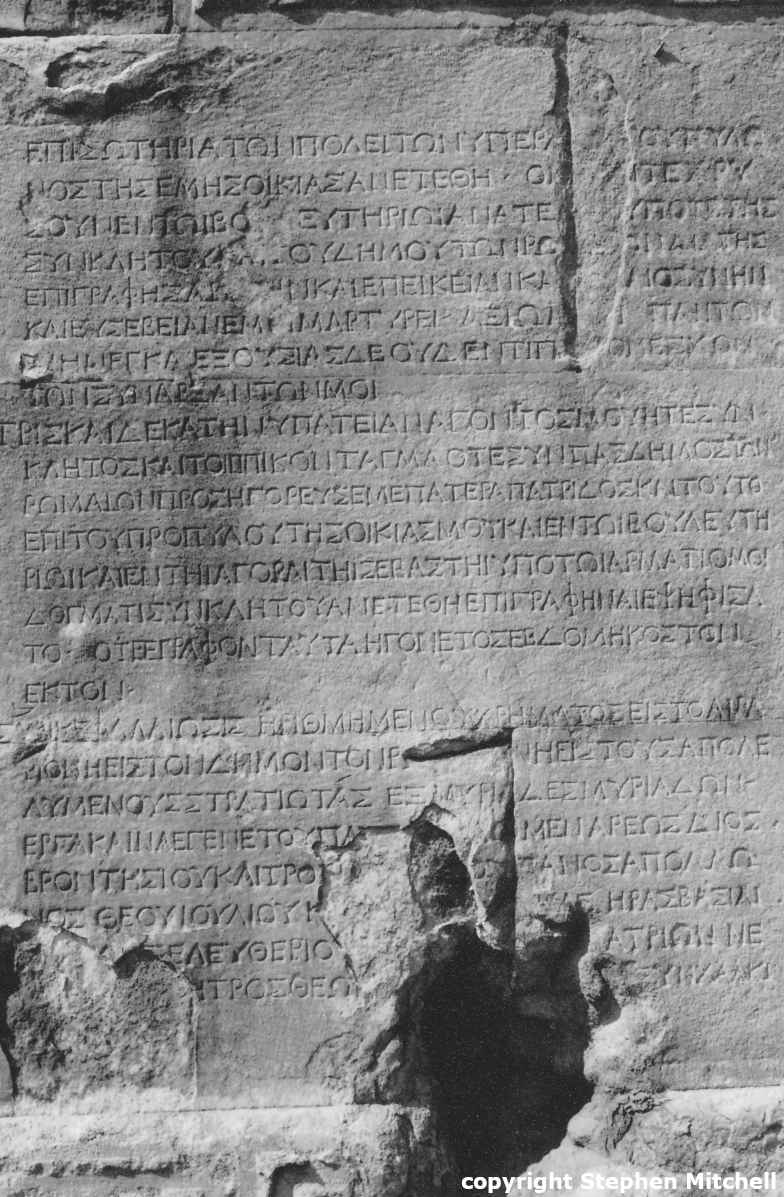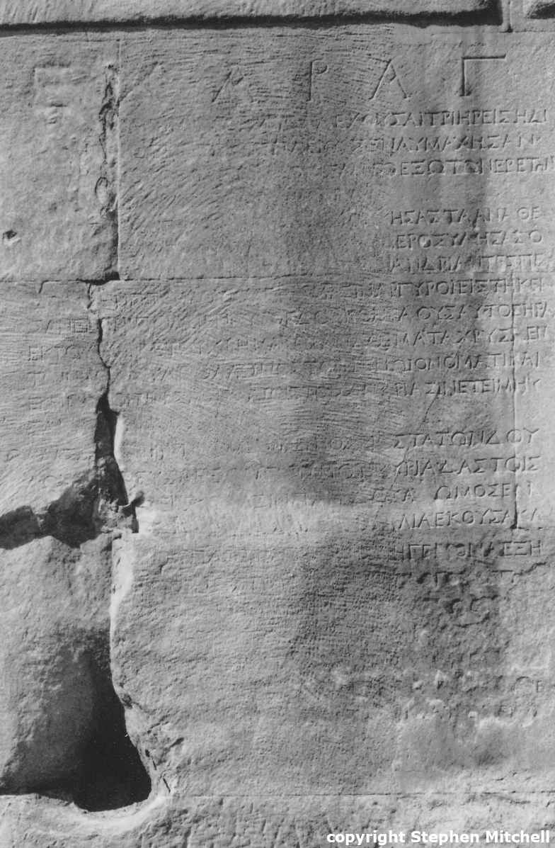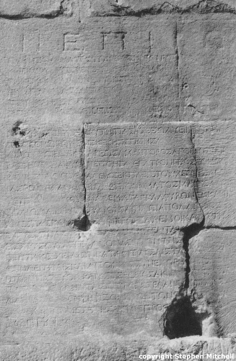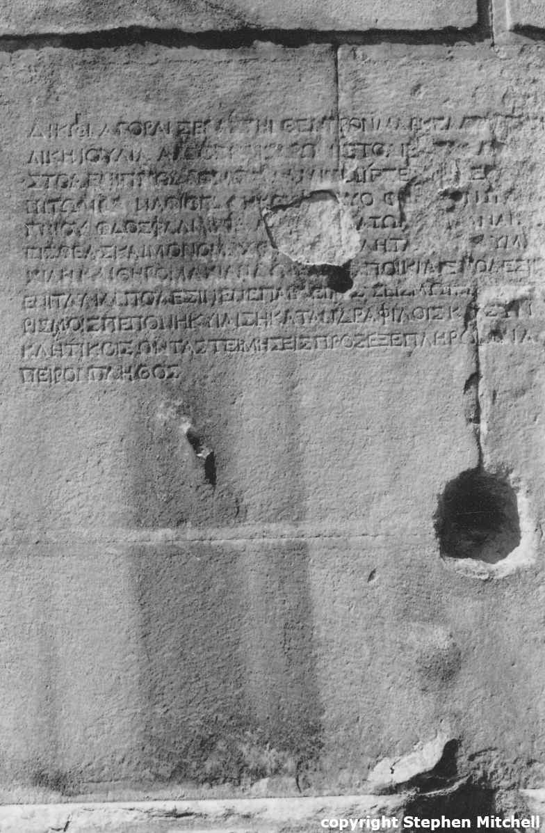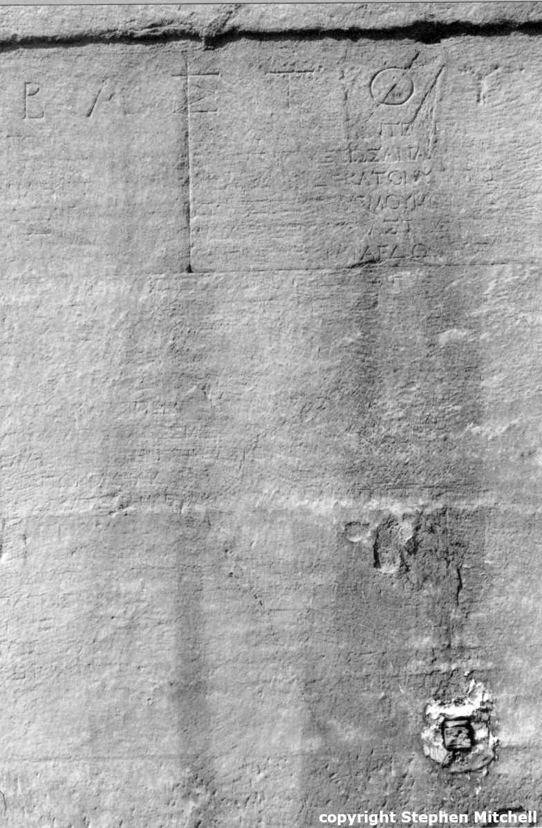 The Greek version of the inscription is located on the southeastern wall of the temple. During the Ottoman period, it was preserved as it remained within the interior of houses built adjacent to this wall. However, it was also partially damaged due to the recesses where the ceiling beams of these houses were embedded. The inscription consists of 35 sections and 1 appendix and is engraved in 19 columns. The English text presented here is shared with the permission of Professor Dr. Alison E. Cooley. (A. E. Cooley. 2009. Res Gestae Divi Augusti, Text, Translation, and Commentary, Cambridge University Press.) The Turkish text is included here with the permission of Professor Dr. Turhan Kaçar.