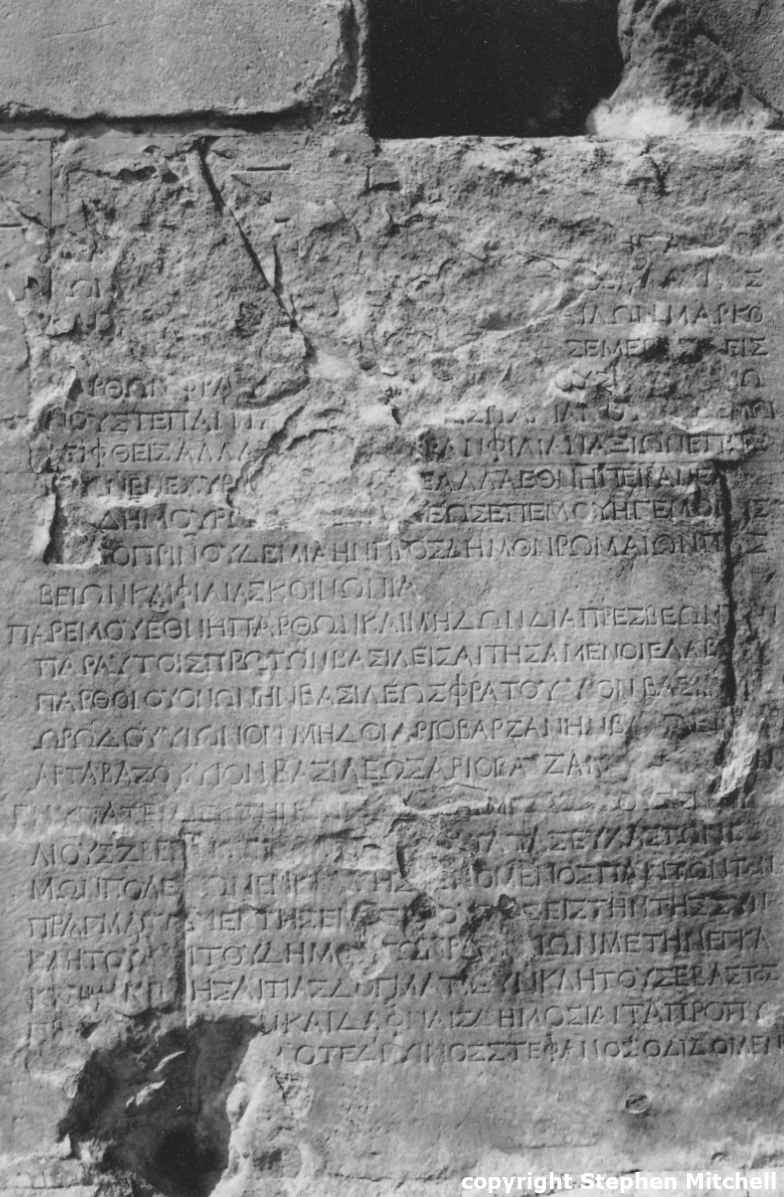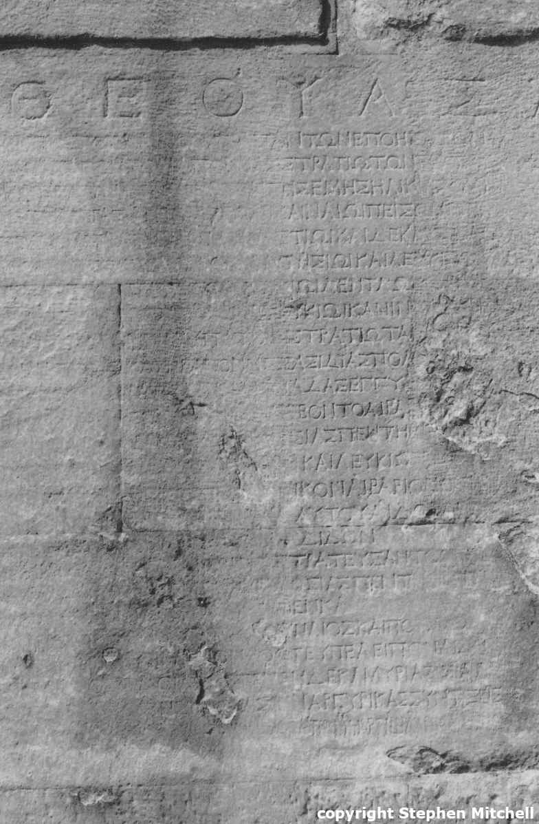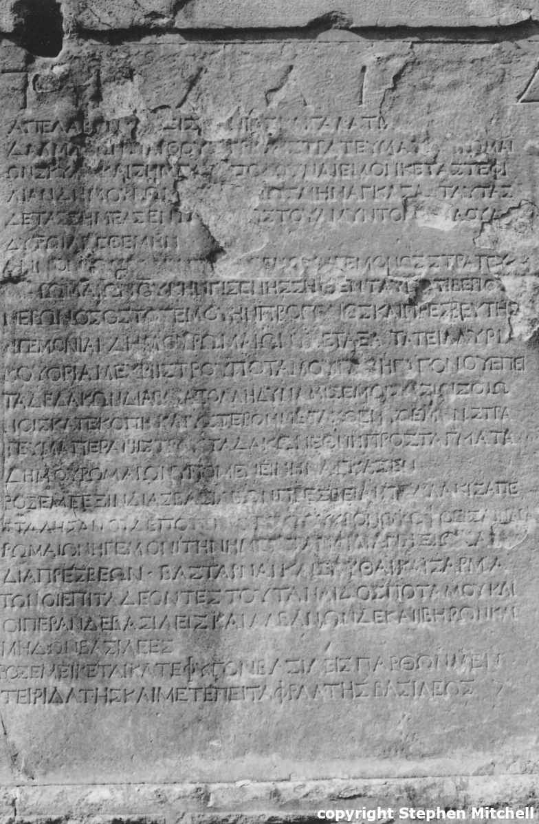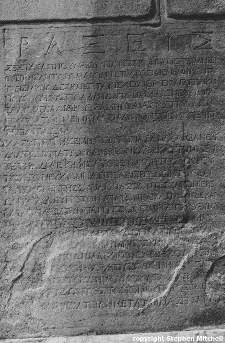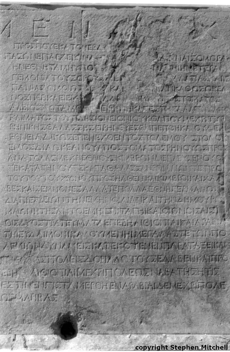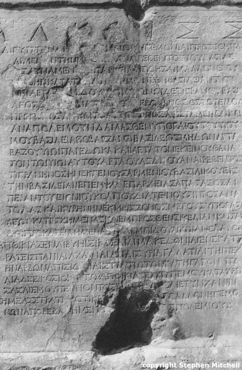 1. [εἰς ν]αοὺς πασῶν πόλεων τῆς Ἀσίας νεικήσας τὰ ἀναθέ[ματα ἀπ]οκατέστησα, [ἃ] κατεσχήκει ἱεροσυλήσας ὁ ὑπ᾽ ἐμοῦ καταγωνισθεὶς πολέ[μιος]. 2. ἀνδριάντες πεζοὶ καὶ ἐϕιπποί μου καὶ ἐϕ᾽ ἅρμασιν ἀργυροῖ εἱστήκεισαν ἐν τῆι πόλει ἐνγὺς ὀγδοήκοντα, οὓς αὐτὸς ἦρα, ἐκ τούτου τε τοῦ χρήματος ἀναθέματα χρυσᾶ ἐν τῶι ναῶ[ι] τοῦ Ἀπόλλωνος τῶι τε ἐμῶι ὀνόματι καὶ ἐκείνων, οἵτινές με [τ]ούτοις τοῖς ἀνδριᾶσιν ἐτείμησαν, ἀνέθηκα.